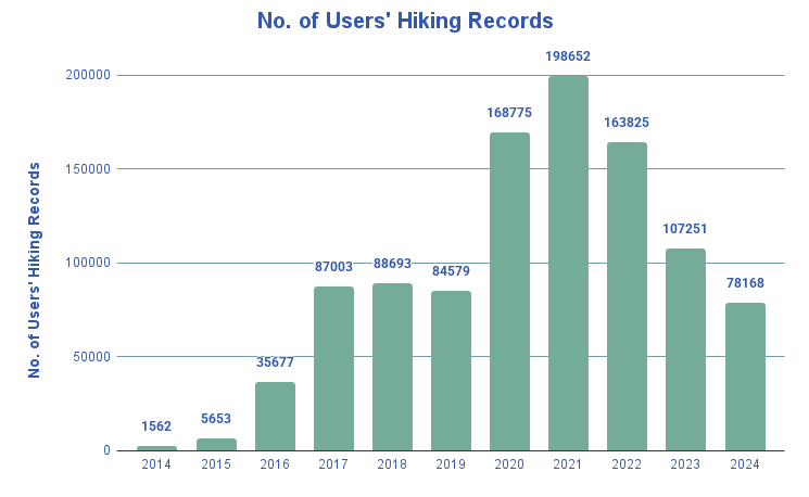 The hiking trend in Hong Kong has become a hot topic in recent years, and our decade-long data has witnessed the ups and downs of this phenomenon. As clearly shown by our data, the most notable hiking boom occurred during the pandemic period from 2020 to 2022, when the number of TrailWatch hiking records increased significantly, reaching a peak in 2021. Starting from 2022, the number of records gradually declined, returning to pre-pandemic levels in 2024. However, the fading of this trend doesn’t mean that the wear and tear caused by the crowds can simultaneously recover. The carrying capacity of Hong Kong’s countryside remains a concern worthy of continued attention.