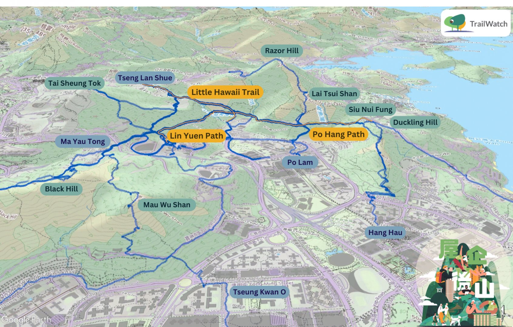 If you want to go hiking, besides venturing out to trails in Sai Kung or Lantau Island, you can also explore your own Backyard Trails! Backyard Trails refer to trails that are within a 15-minute walking distance from dense residential areas. These trails are not located within country parks or urban parks, but are typically in the green belt. Usually, they are frequented by nearby residents and morning exercisers. TrailWatch’s recommended routes section has recorded 34 Backyard Trails, including the Little Hawaii Trail and Po Hang Path to Lin Yuen Path (marked in orange on the map below).
