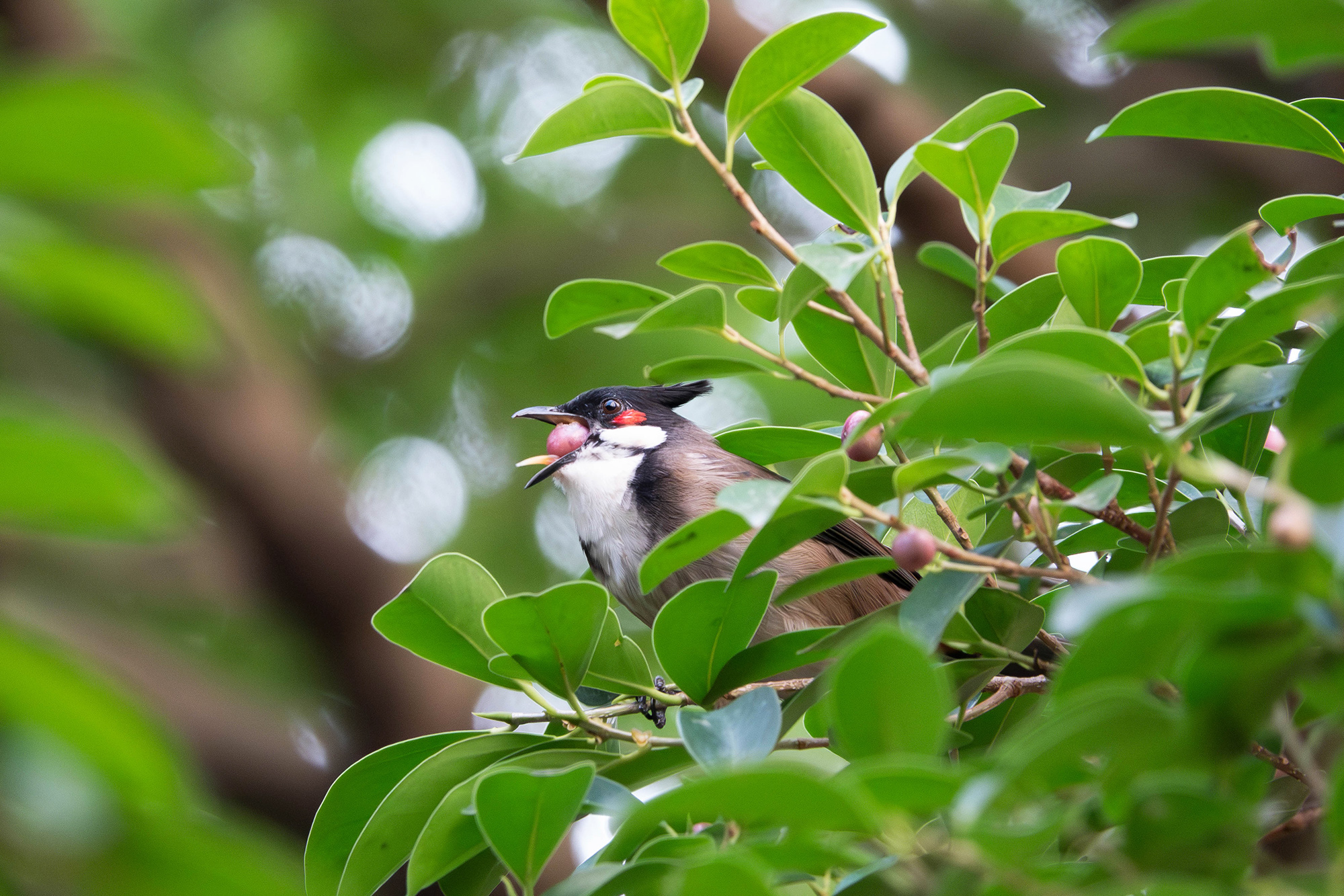 走經大榕樹下都會聽到聒噪的鳥聲,當枝條果實纍纍,樹上就會擠滿紅耳鵯和白頭鵯。扁球形的粉紅色果實小巧,鵯科雀鳥的嘴巴正好能將果實完整地一口吞下,吃大餐不費吹灰之力。榕樹果實的核再順排泄物在另一端出來,種子再次掉進石牆空隙間,等待發芽。哺乳類動物如赤腹松鼠也在結滿果實的枝葉間大快朵頤。由於細葉榕四季均有機會結果,因此能全年為動物提供食物來源。