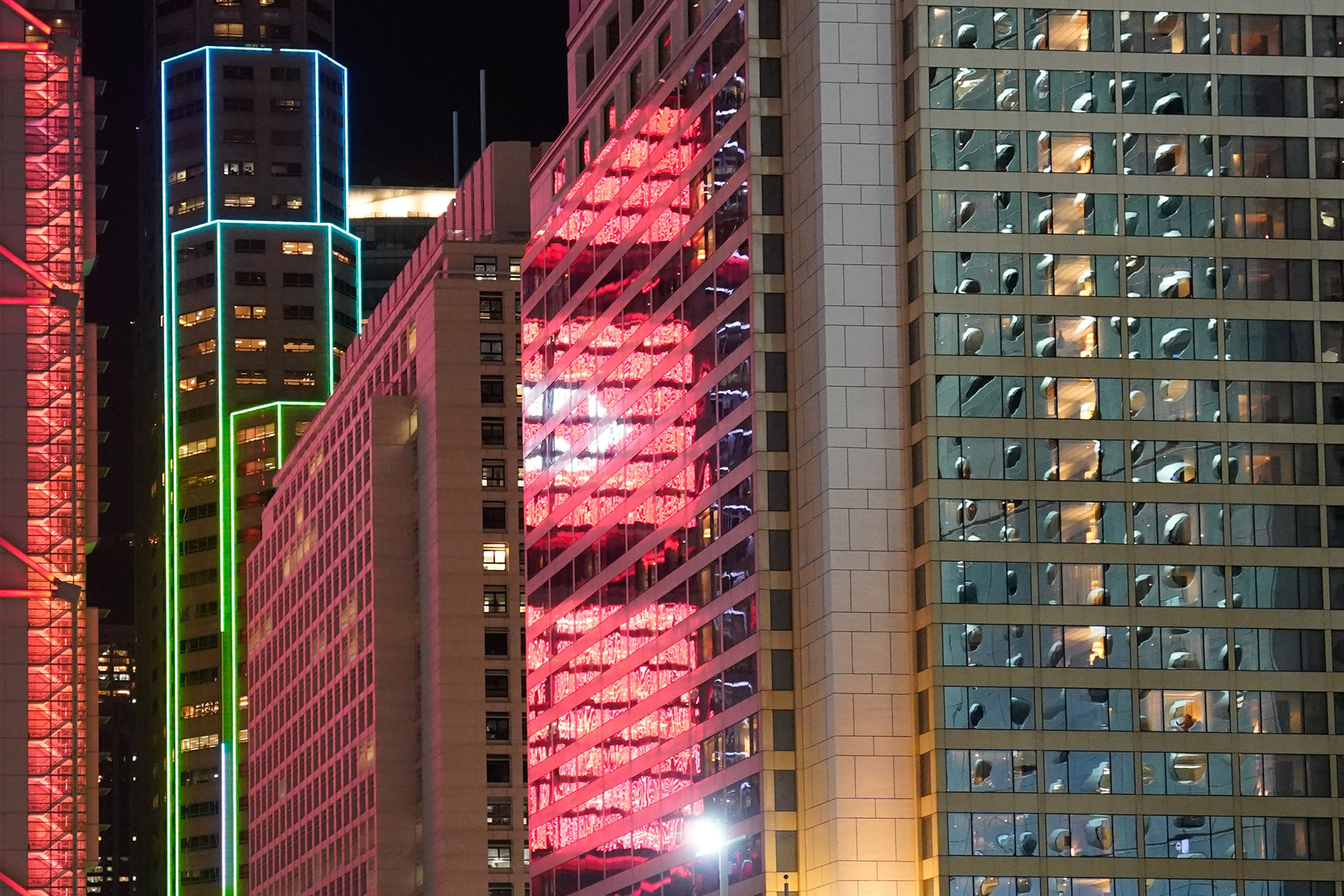 中環一幢玻璃大樓倒映出城市燈影。(攝:香港觀鳥會)