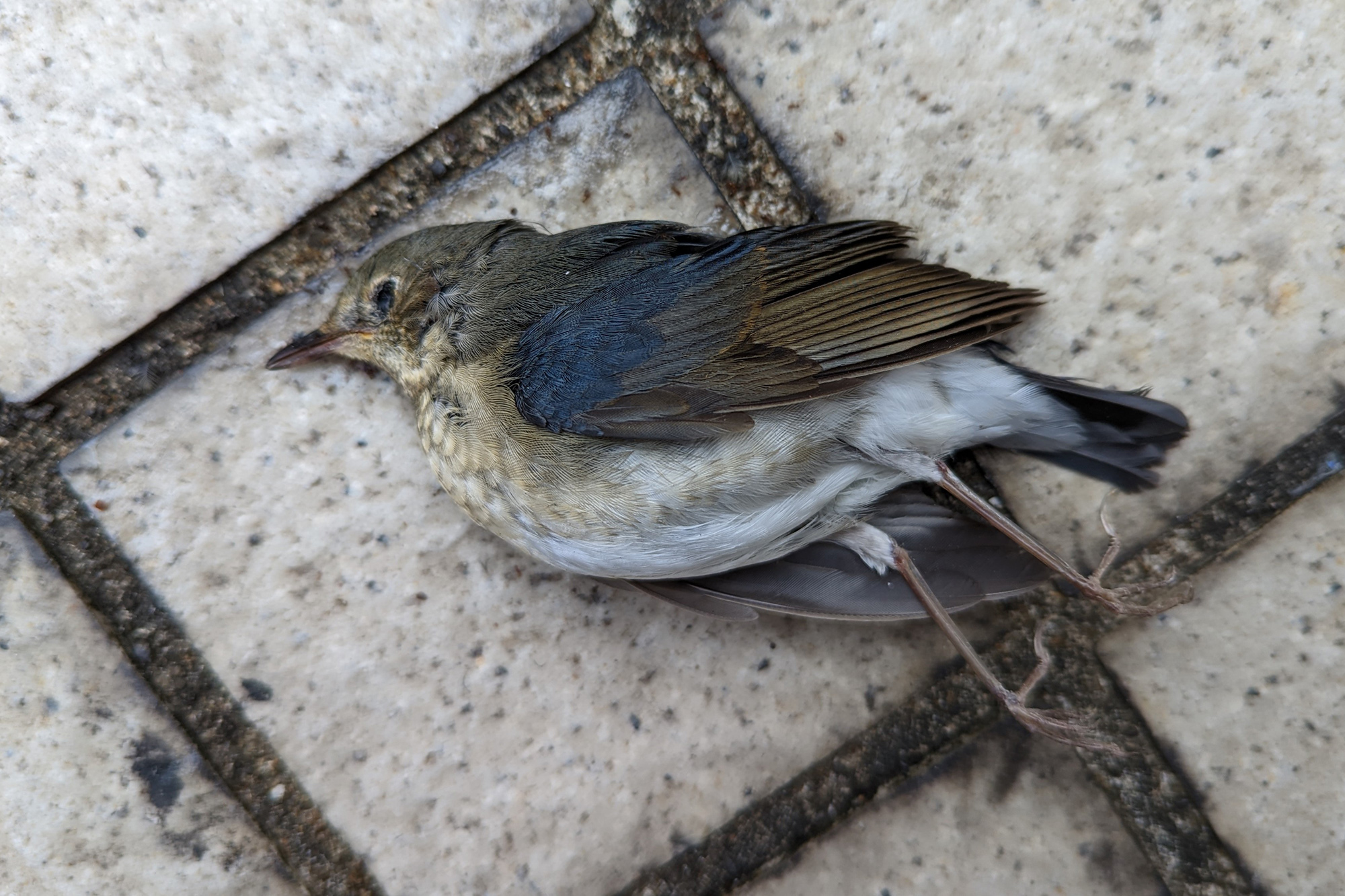 2022年9月18日,陽光下有一抹寶藍色靜臥在大埔那打素醫院玻璃幕牆下。那是一隻藍歌鴝幼鳥。同一星期,九龍城一間學校也有一隻藍歌鴝幼鳥倒臥在玻璃窗前