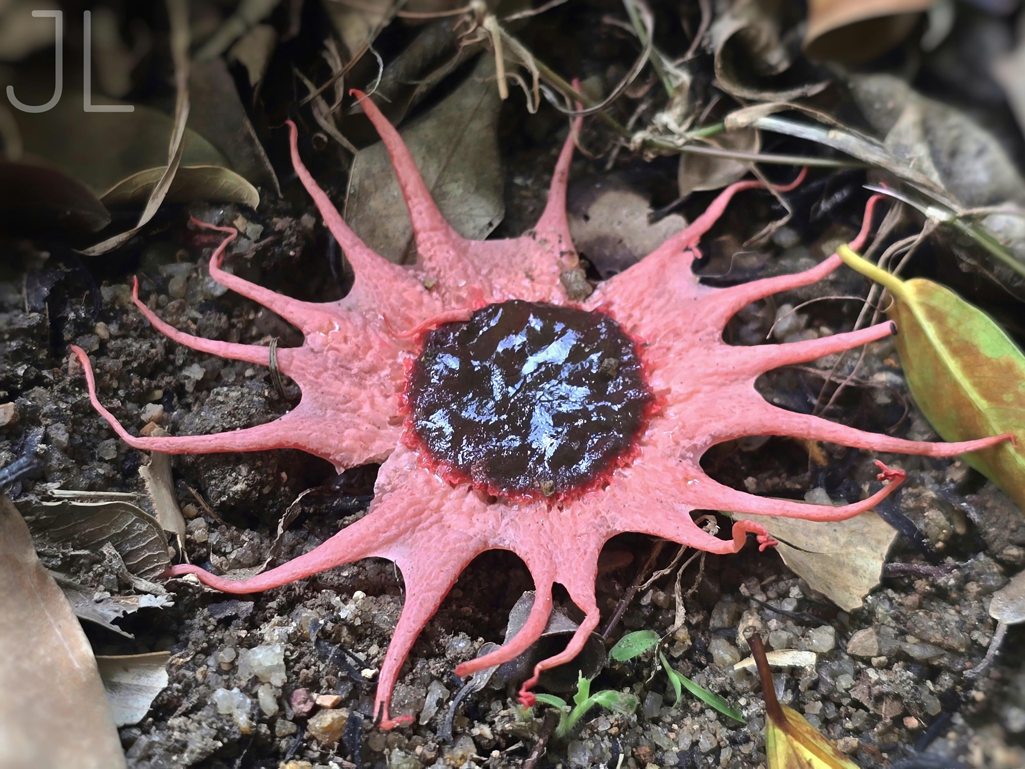 外形像惡魔的真菌,神奇而漂亮,菌直徑約10cm。幾年前在神山見過,有少量腐臭味,圖中這個體在香港發現卻沒有臭味。