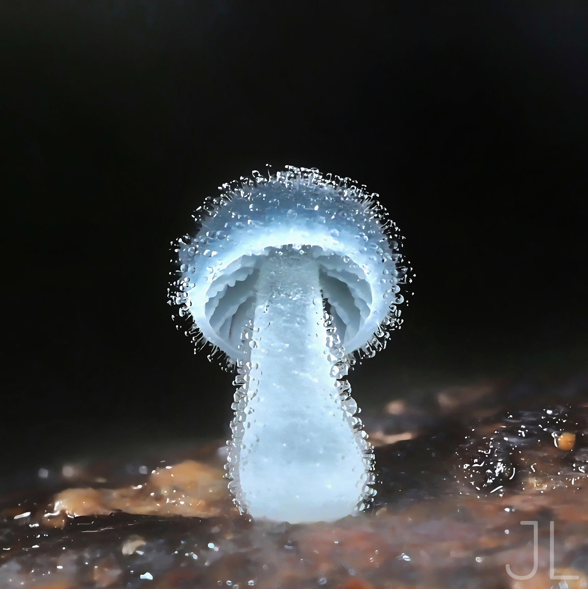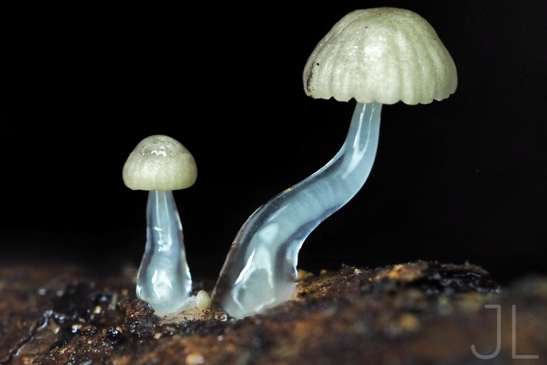 在枯枝、枯葉或枯木上也有機會發現,成菌的頂部直徑在5mm內,菌柄帶透明的黏液,濕度越高,黏液也越厚,傘褶延生,此種只有菌絲會產光。