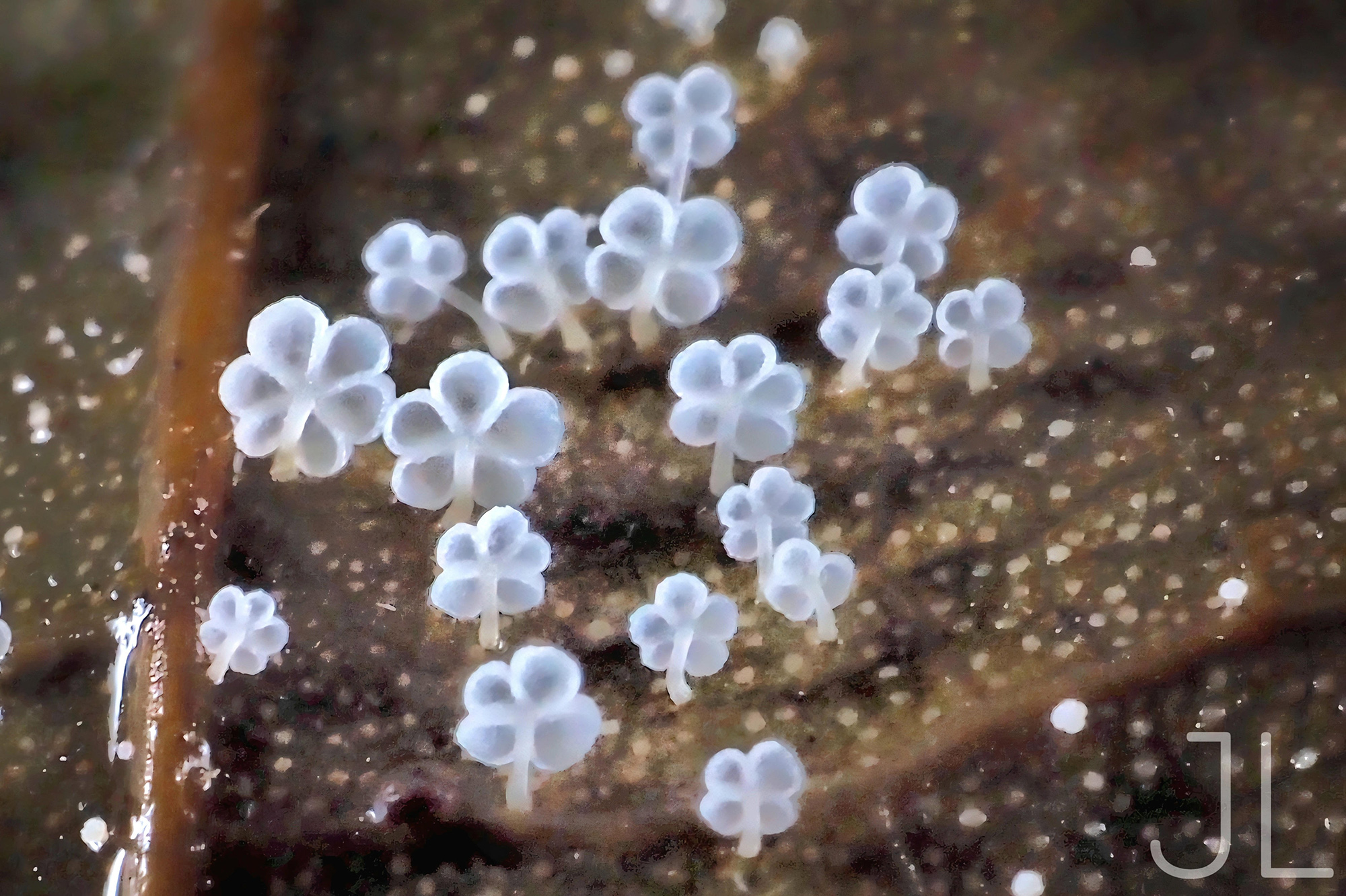 於十至十二月份,於山茶屬植物的枯葉上生長淡褐色的小群落,初期呈杯狀,後長出深褐至黑色菌柄,偶有分叉,沒傘褶,傘徑最大3mm,整體最高可達24mm,表面有結晶體。