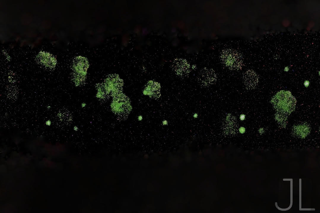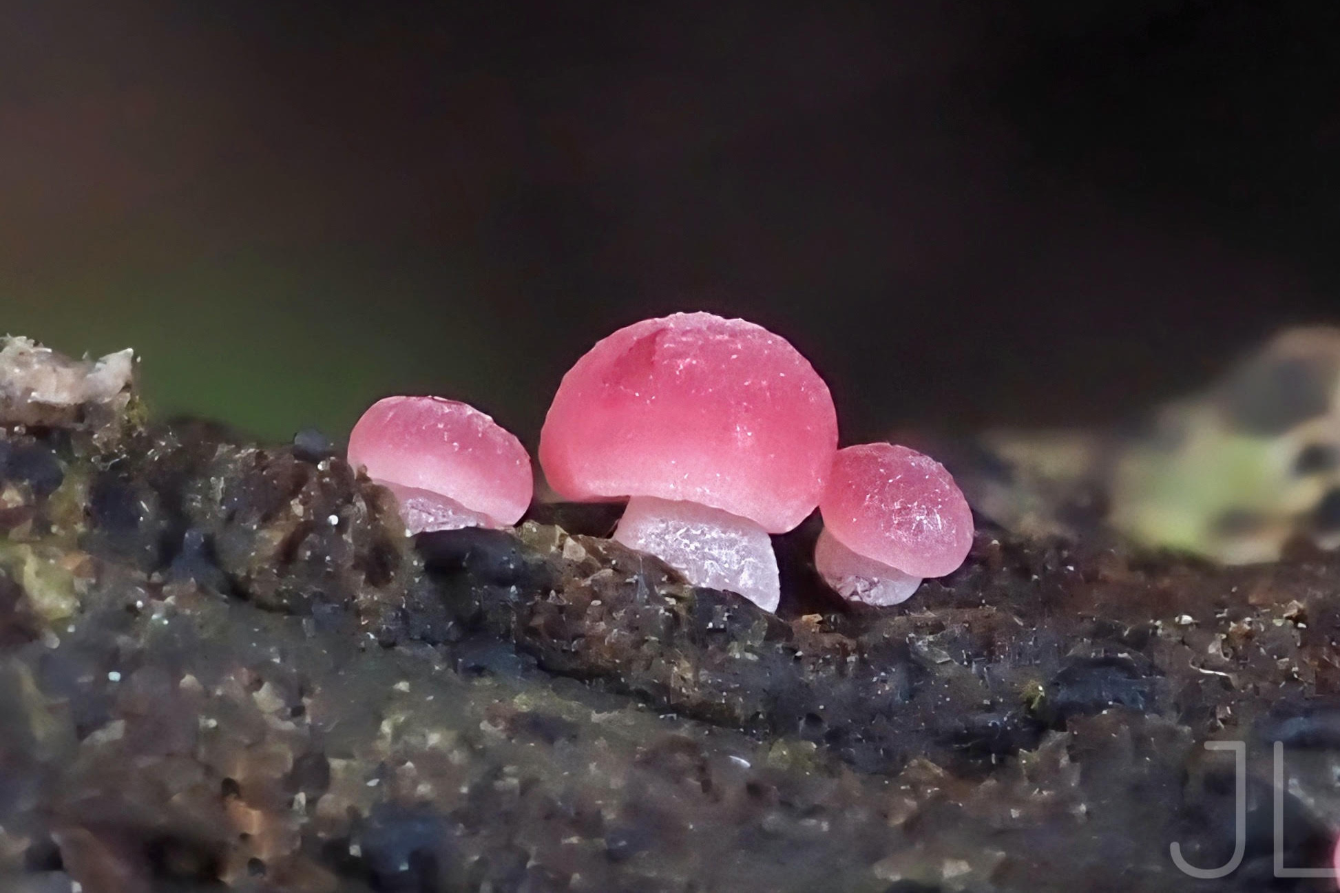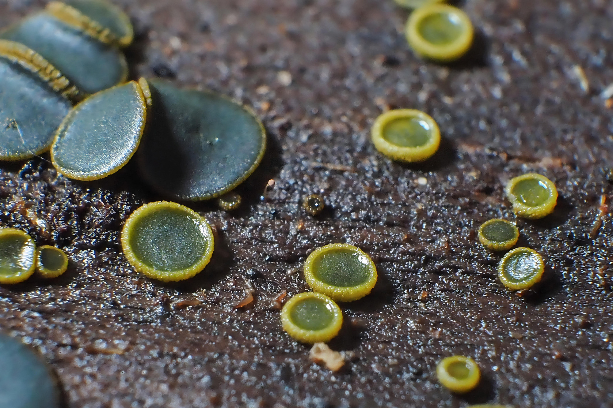 群生於枯木上,盤菌直徑最大有5mm,體呈墨綠色,外圍呈芥末色,成熟後越見深色。