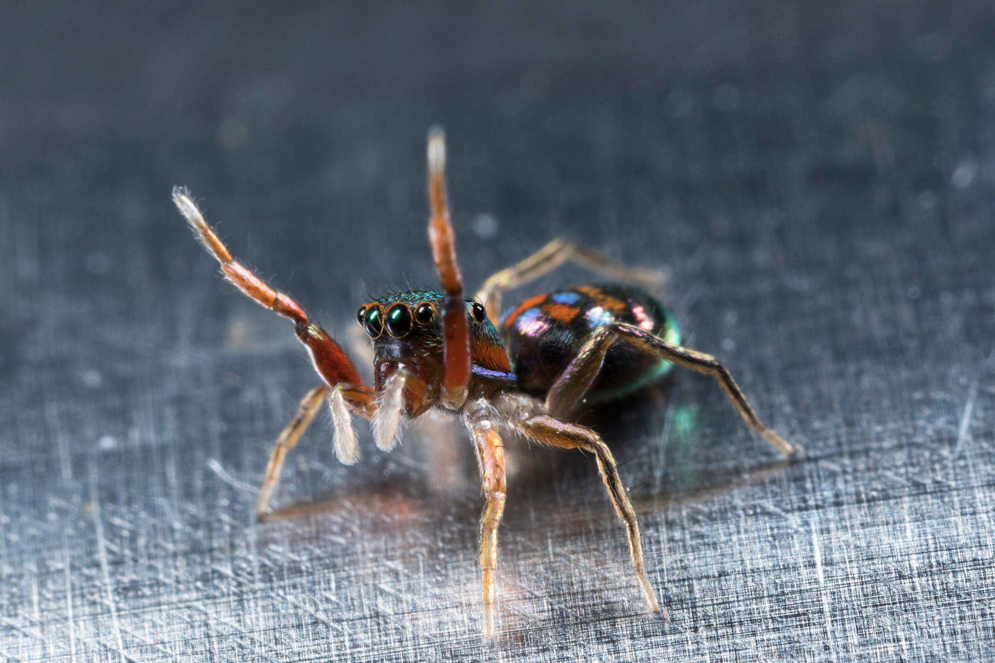 跳蛛的外貌十分可愛吸引,圖中的科氏翠蛛體長只有幾毫米,用微距鏡頭才能捕捉牠最豔麗的一面。
