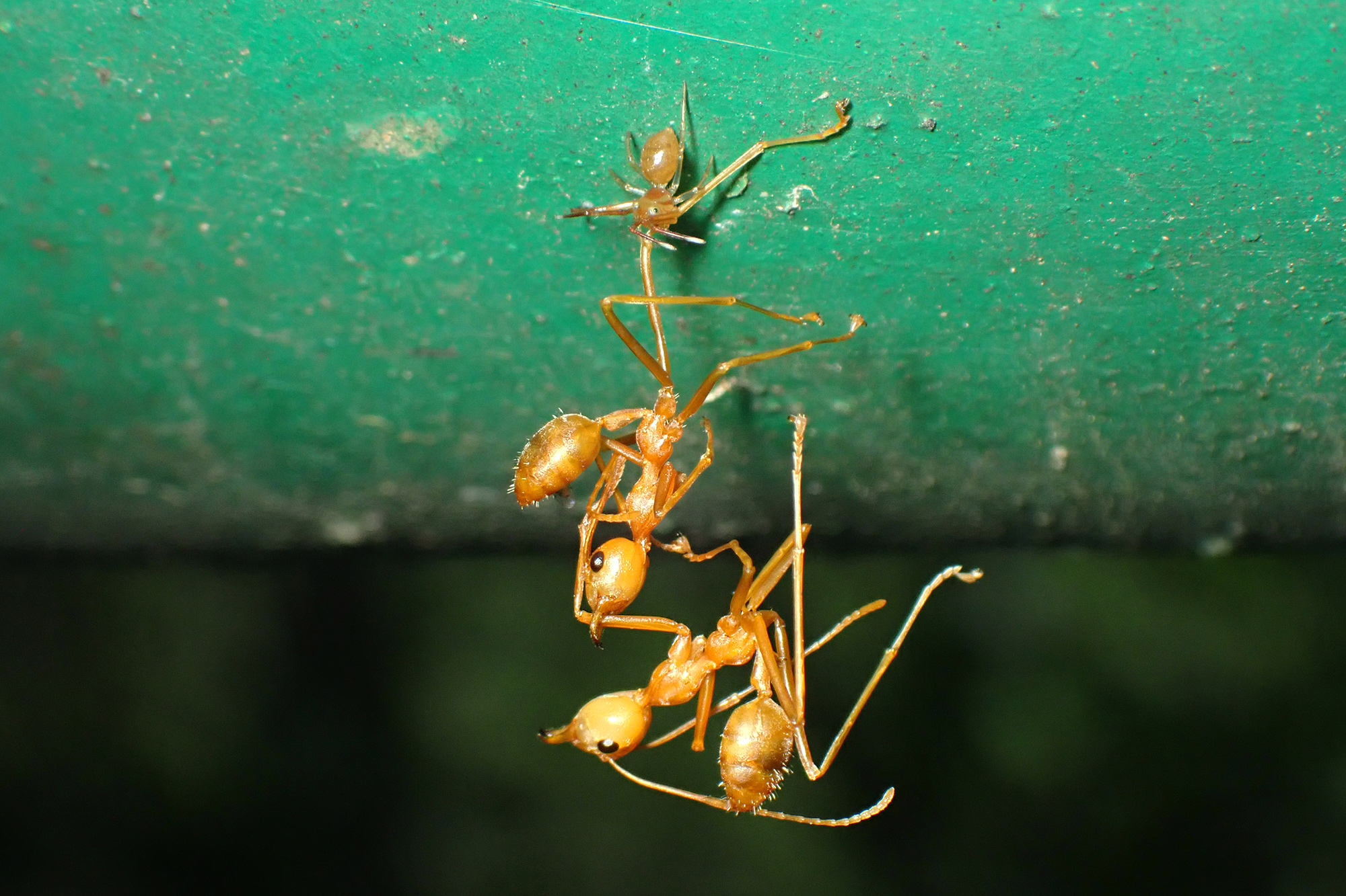 蟻蟹蛛體型比黃猄蟻細小,但竟然可以拉動兩隻成蟻!