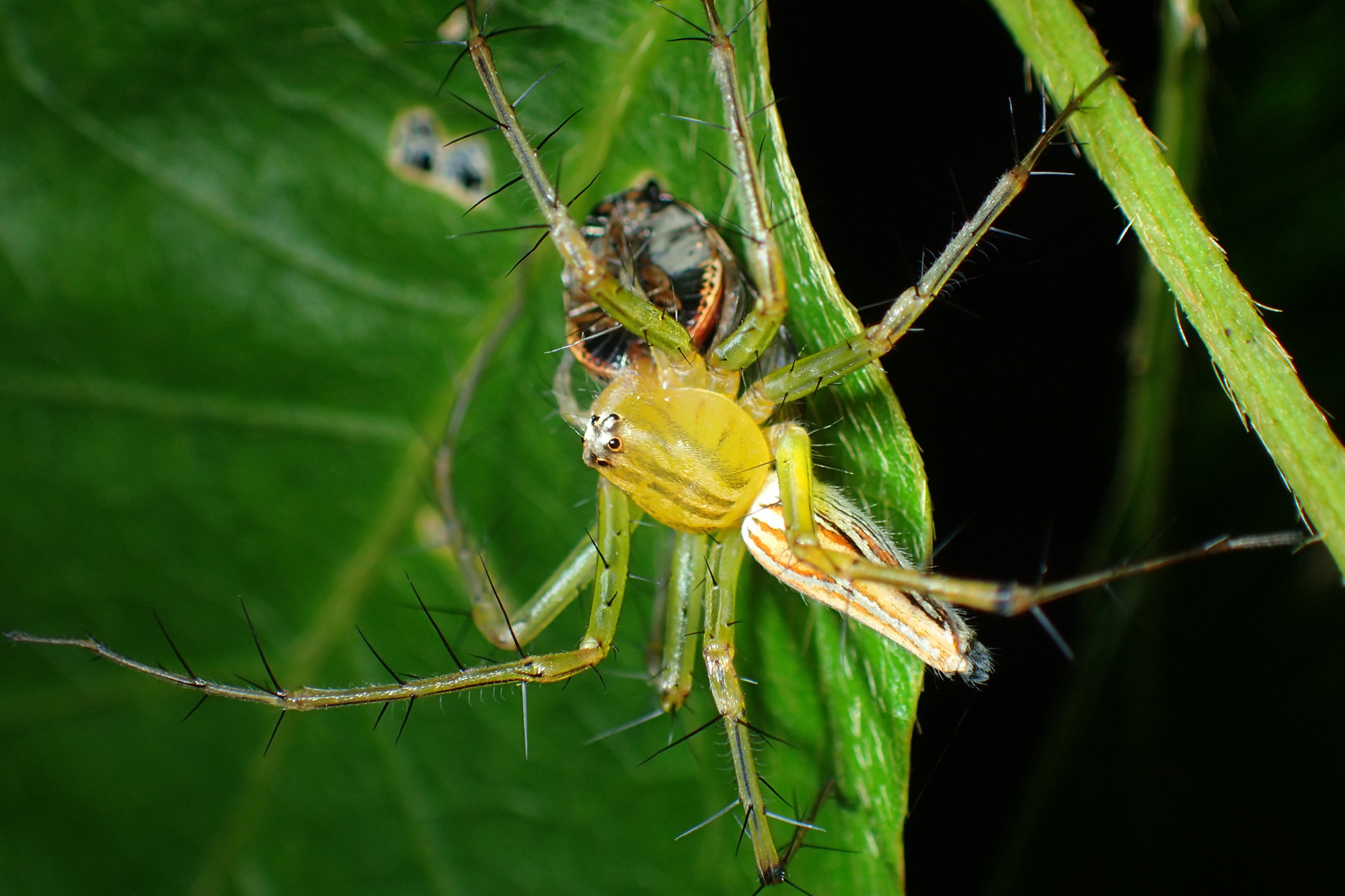 若大家夜行使用頭燈照明的話,常會看到一些地面或枯葉堆上的反光點,既可能是水珠的反光,但更大可能是蜘蛛眼睛反射的光點。若觀察到是褐色或有黑斑的蜘蛛,且有頗長的黑刺腳毛,大多屬於狼蛛科的蜘蛛。牠們大多為夜行性,依賴長毛的觸感,在黑夜中仍能有效捕捉昆蟲如草蜢、蟋蟀等。另外,當大家走到灌叢草地的生境時,不論日或夜,留意葉面或葉底的蜘蛛,若牠們腳上黑刺更長更多,便是貓蛛科的蜘蛛。貓蛛行動迅速,既能跑也能跳,擁有更敏銳的觸感,任何光度都不影響捕獵的能力。