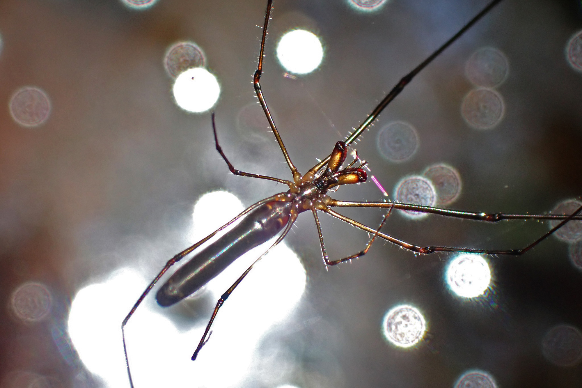 喜歡行澗或者到溪邊活動的朋友,定必見過在石塊之間水平或打斜建構的蜘蛛網,與在樹林中的垂直圓網有明顯分別。在水面結網的蜘蛛主要是肖蛸科的蜘蛛又叫長腳蛛。一如其名,牠們三對腳都頗長,而身形也是修長的。故此,在休息的時候,有些會依附在樹枝上,只有最短的第三對腳抓著樹枝,其餘的都上下伸延,完全融入環境之中。牠們在預備覓食時會待在網中央,腹部朝天,眼睛望向水面。當水生昆蟲如蜉蝣、石蛾等在水中羽化後,成蟲一起飛就很容易衝向架在水面的平網,成為肖蛸的獵物。